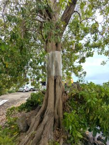 L’objectif de cette technique était d’empêcher les iguanes de grimper dans les arbres en zones boisées ou semi-urbaines en enveloppant les troncs d’un matériaux lisse (Fig. 1). Les iguanes ainsi contraints de rester au sol étaient ensuite capturés à l’aide de cannes à collier (technique la plus utilisée dans les caraïbes). Au total, sur les trois années du projet, 156 iguanes ont pu être capturés grâce aux manchons installés sur les arbres. Ce dispositif peu coûteux a ainsi bien permis l’exclusion des iguanes et leur capture. C’est un outil adapté pour capturer des iguanes dans des zones à fortes densités d’individus, faciles d’accès à pied et arborées. Il reste toutefois soumis aux risques de dégradation et nécessite in fine un couplage avec la capture à la canne des individus.