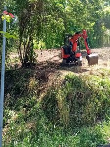 - Abattage et dessouchage mécanique des arbres et arbustes exotiques : extraction totale lorsque cela ne risquait pas d’impacter la stabilité du talus dans les zones pentues, rognage profond pour empêcher les rejets.