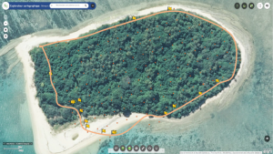 Le protocole d’éradication consistait sur chaque îlot à baliser tous les points d’épandage suivant un quadrillage (Fig. 5). Puis, afin d’établir un état initial, un contrôle préalable d’abondance des rongeurs a été réalisé à l’aide d’une soixantaine de tapettes à rats. Deux épandages manuels de raticide ont ensuite été réalisés et ont été suivis de la pose de postes d’appâtage pour contrôler la présence de rat après la dératisation. Ces postes d’appâtage ont été installés et suivis en lisière de forêt, aux points d’introductions principaux (sur la côte face à la Grande Terre, sur la côte face à l’arrivée des déchets transportés par les crues) et sur la côte face au récif (Fig. 6). Début 2025, aucun rongeur n’était observé sur les îlots.